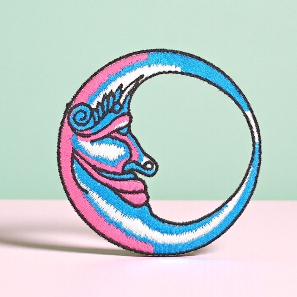 Un croissant de lune graphique aux couleurs vibrantes. Ce patch brodé mêle rose fuchsia, bleu turquoise et blanc pour un rendu moderne.