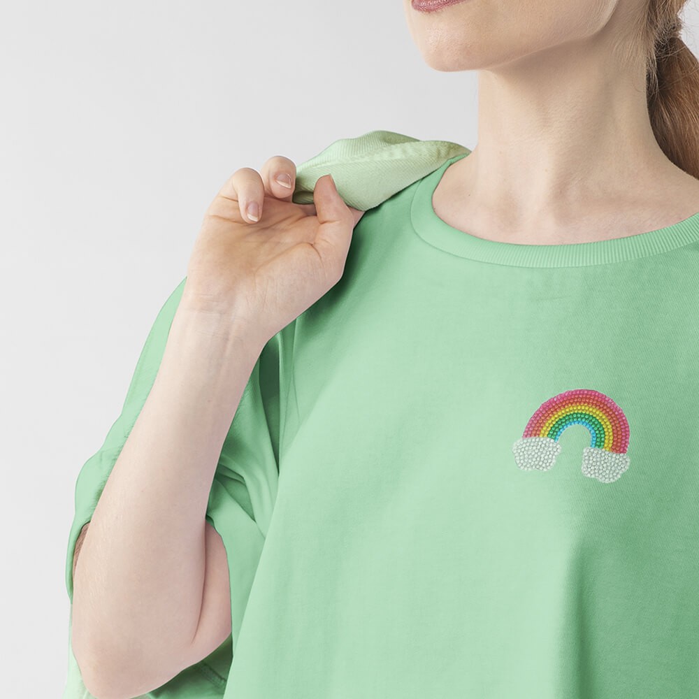 Un petit arc-en-ciel bijou, lumineux et facile à placer, pour donner tout de suite du relief à un vêtement ou un accessoire.