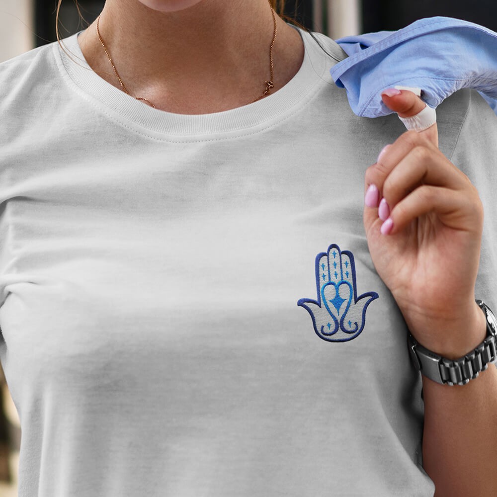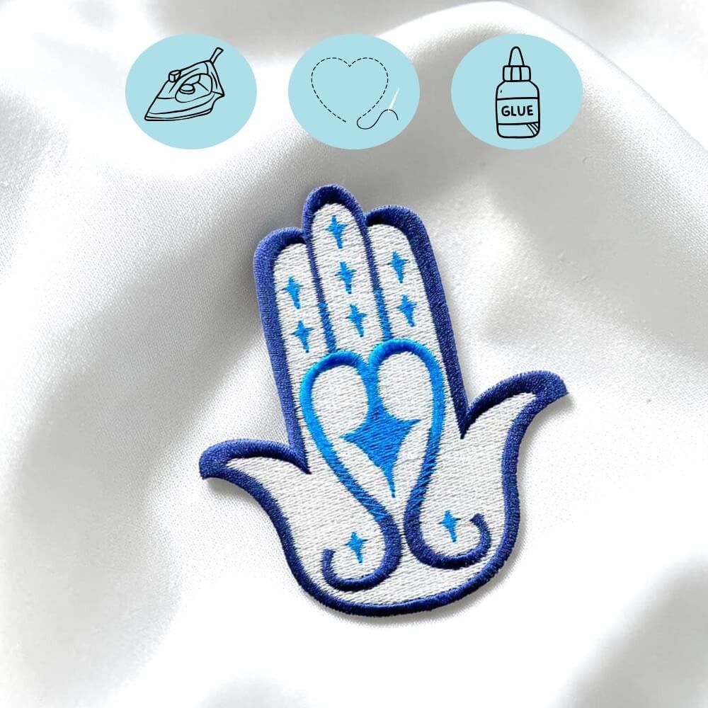 Il y a des motifs qu’on choisit uniquement pour leur beauté, et d’autres qu’on garde près de soi pour ce qu’ils représentent. La Hamsa, aussi appelée Main de Fatma, fait partie de ceux-là. Depuis longtemps, elle est associée à la protection, à la chance et à l’idée d’avancer plus sereinement. Ici, je l’ai brodée dans une palette bleu et blanc lumineuse, avec un coeur au centre, pour en faire un patch à la fois symbolique et délicat, pensé pour habiller un vêtement tout en lui donnant un sens.