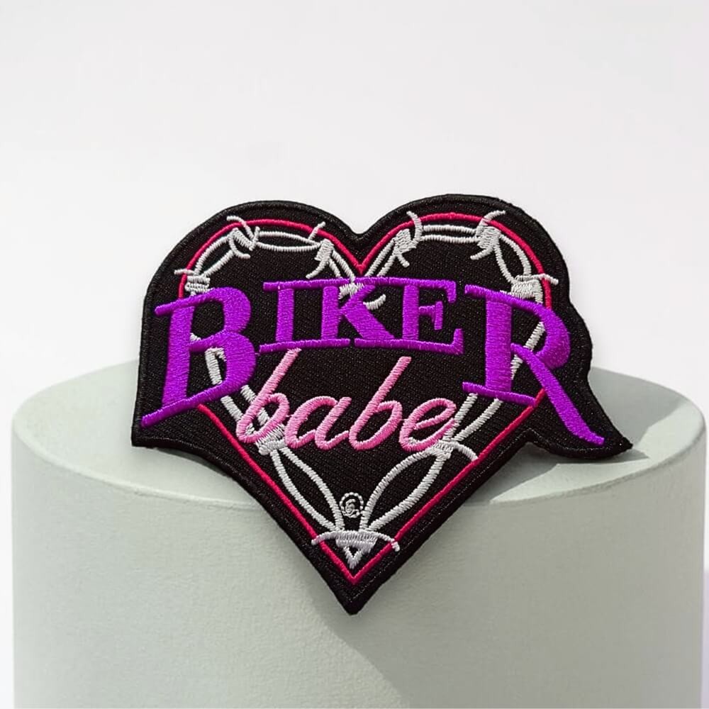 Ce patch brodé reprend un cœur entouré de barbelés, traversé par les mots Biker Babe dans une composition qui mélange douceur et tempérament plus rude.
