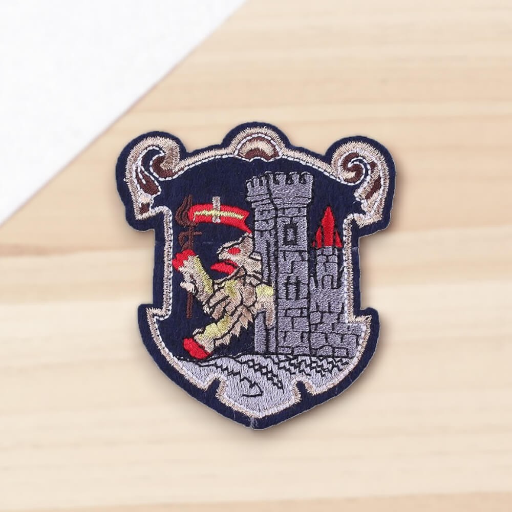 Vous cherchez un patch blason inspiré des armoiries anciennes ? Ce modèle brodé met en scène un château fort et une figure chevaleresque dans un écusson structuré et détaillé.