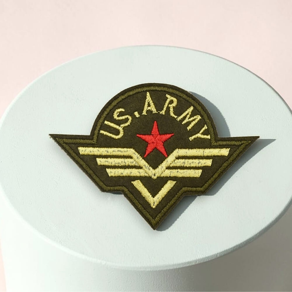 - Motif : inscription US ARMY, étoile rouge et ailes brodées