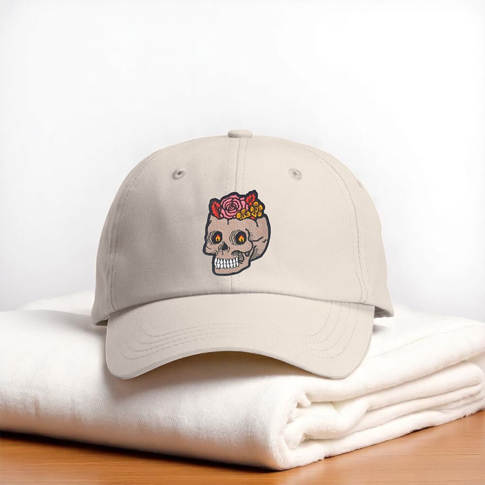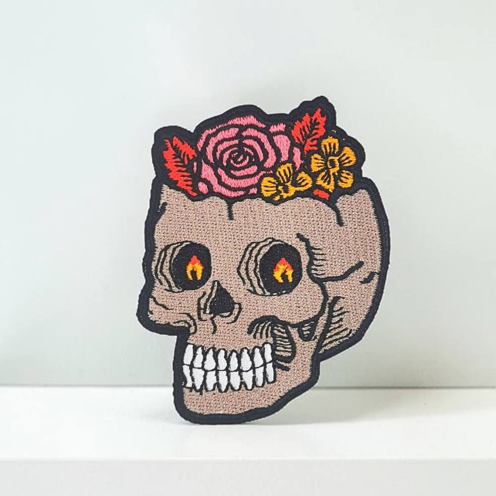 Ce patch crâne fleuri mélange deux univers : La tête de mort apporte la tension, les fleurs amènent la couleur.