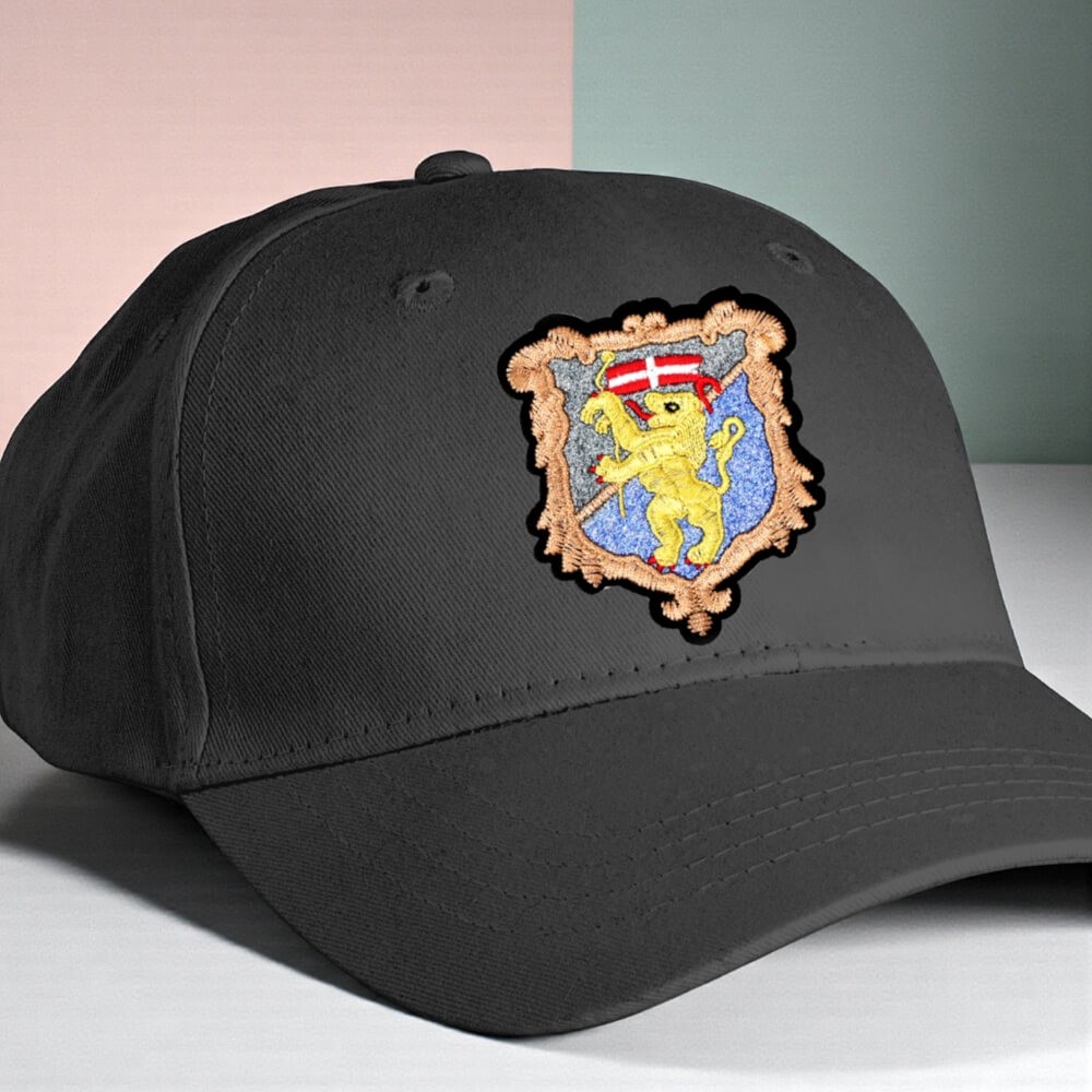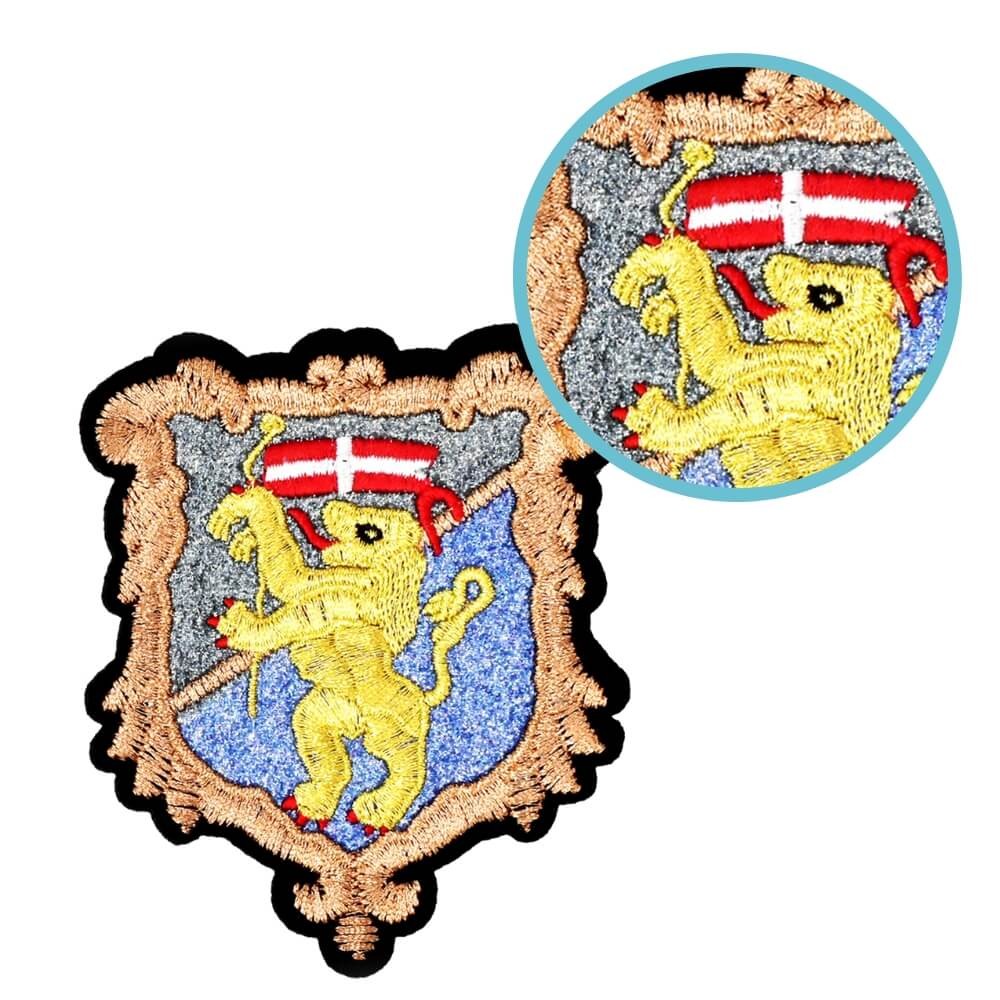 Un blason représentant un lion héraldique doré sur fond structuré, encadré d’un motif baroque contrasté.