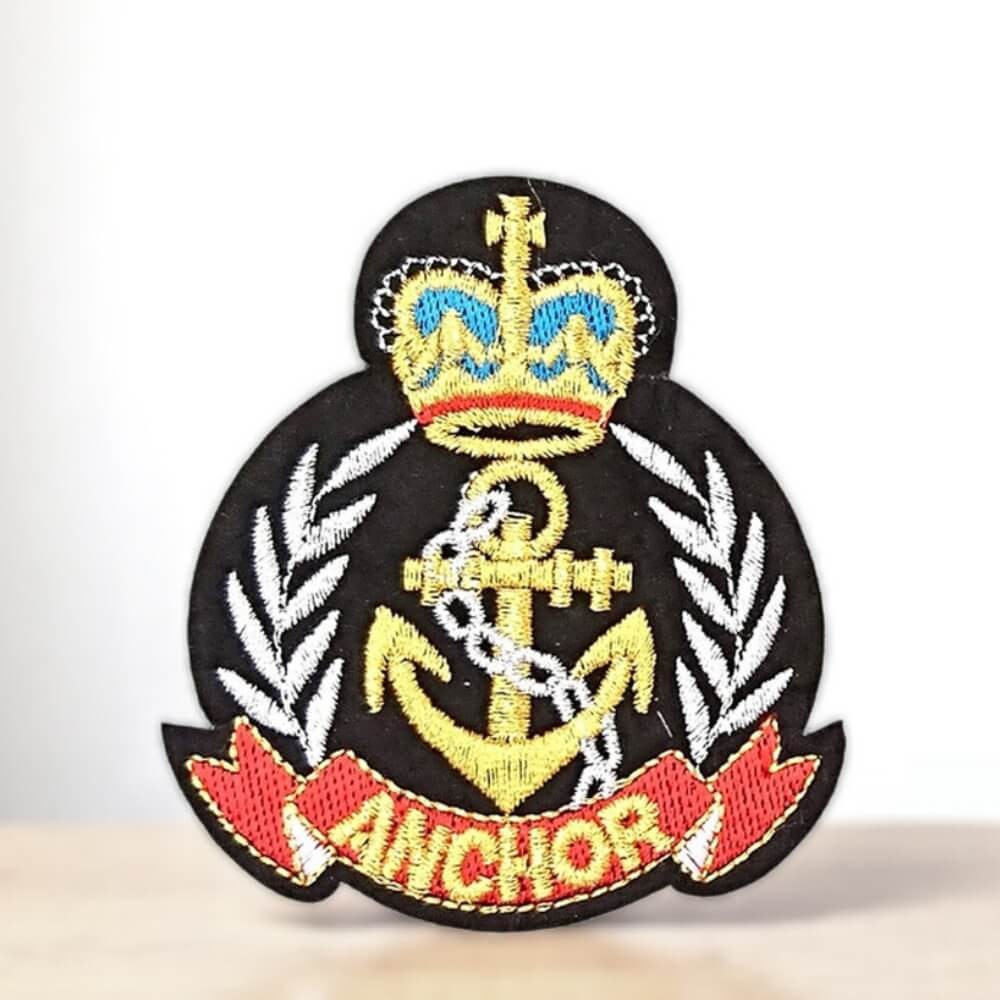 Vous cherchez un patch ancre élégant pour personnaliser une veste, un polo ou un hoodie ? Ce blason brodé associe ancre dorée, couronne stylisée et ruban rouge pour un rendu inspiré des insignes marins.