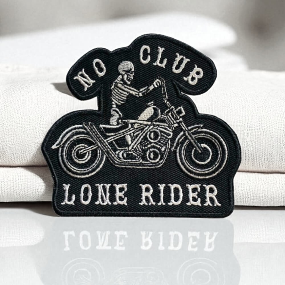 Ce patch brodé reprend une image forte de l’univers biker : un squelette sur sa moto, encadré par les mots “No Club” et “Lone Rider”.