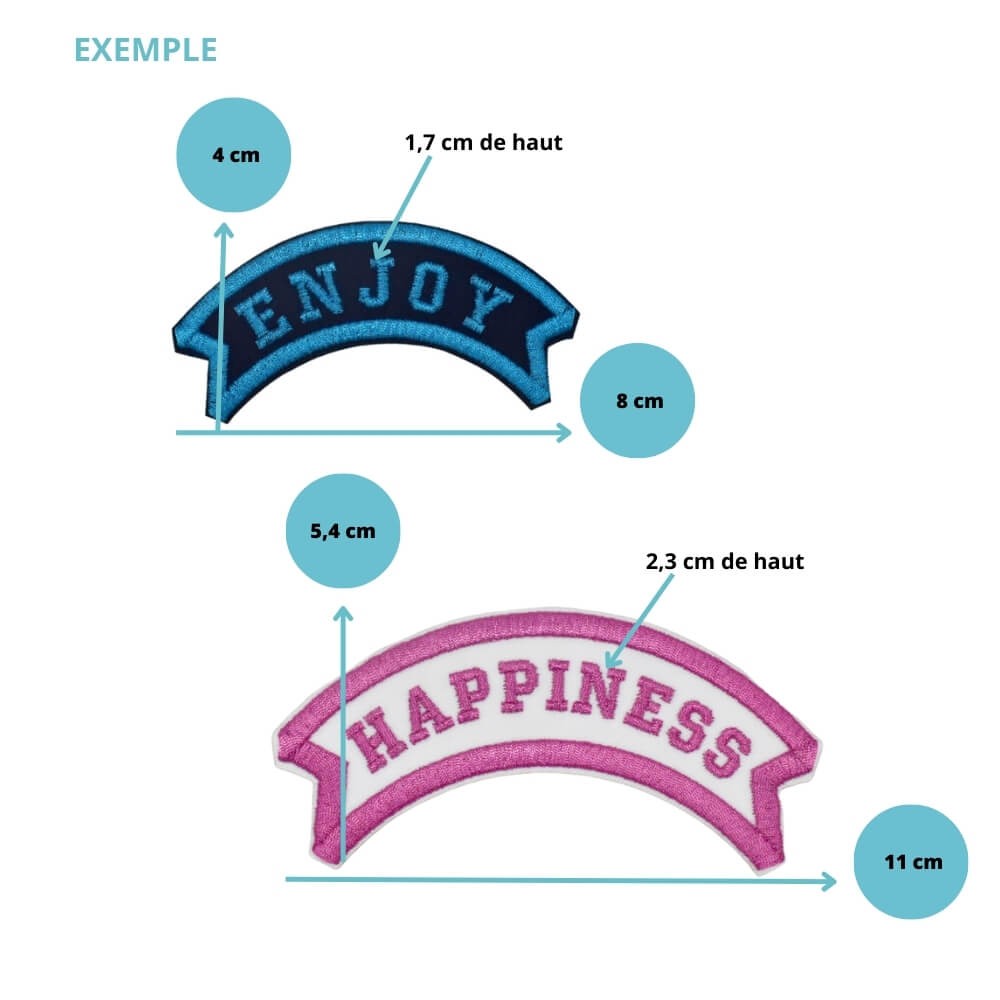 Vous pouvez broder un prénom, un surnom, une devise ou un mot court. Pour le format 8 cm, mieux vaut ne pas dépasser 9 caractères. À partir de 13 cm, le texte peut être réparti sur deux lignes pour rester bien lisible.