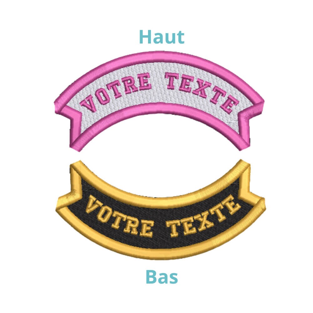 Ce patch bannière personnalisé existe en 7 tailles, du petit format discret au modèle plus visible. Vous choisissez le texte, la police, les couleurs du fond et du lettrage pour créer un écusson brodé facile à assortir à votre univers.