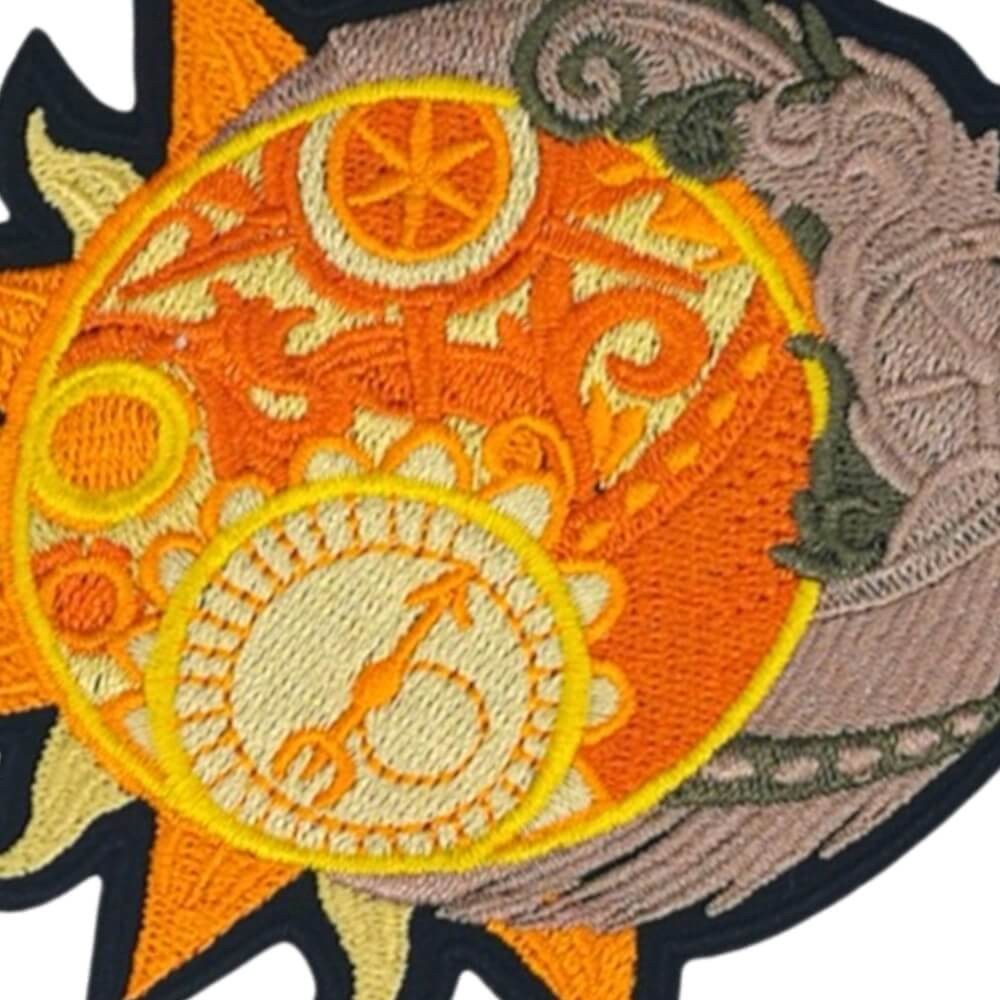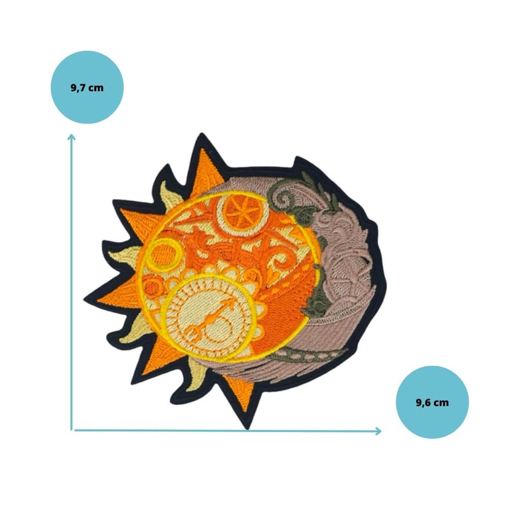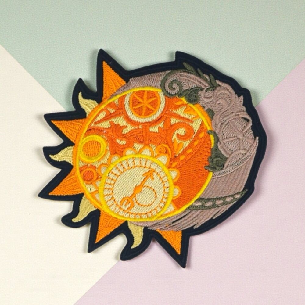 Un mélange puissant entre astrologie et univers steampunk. Soleil flamboyant, croissant de lune mystique et horloge mécanique s’entrelacent dans un patch brodé riche en détails.