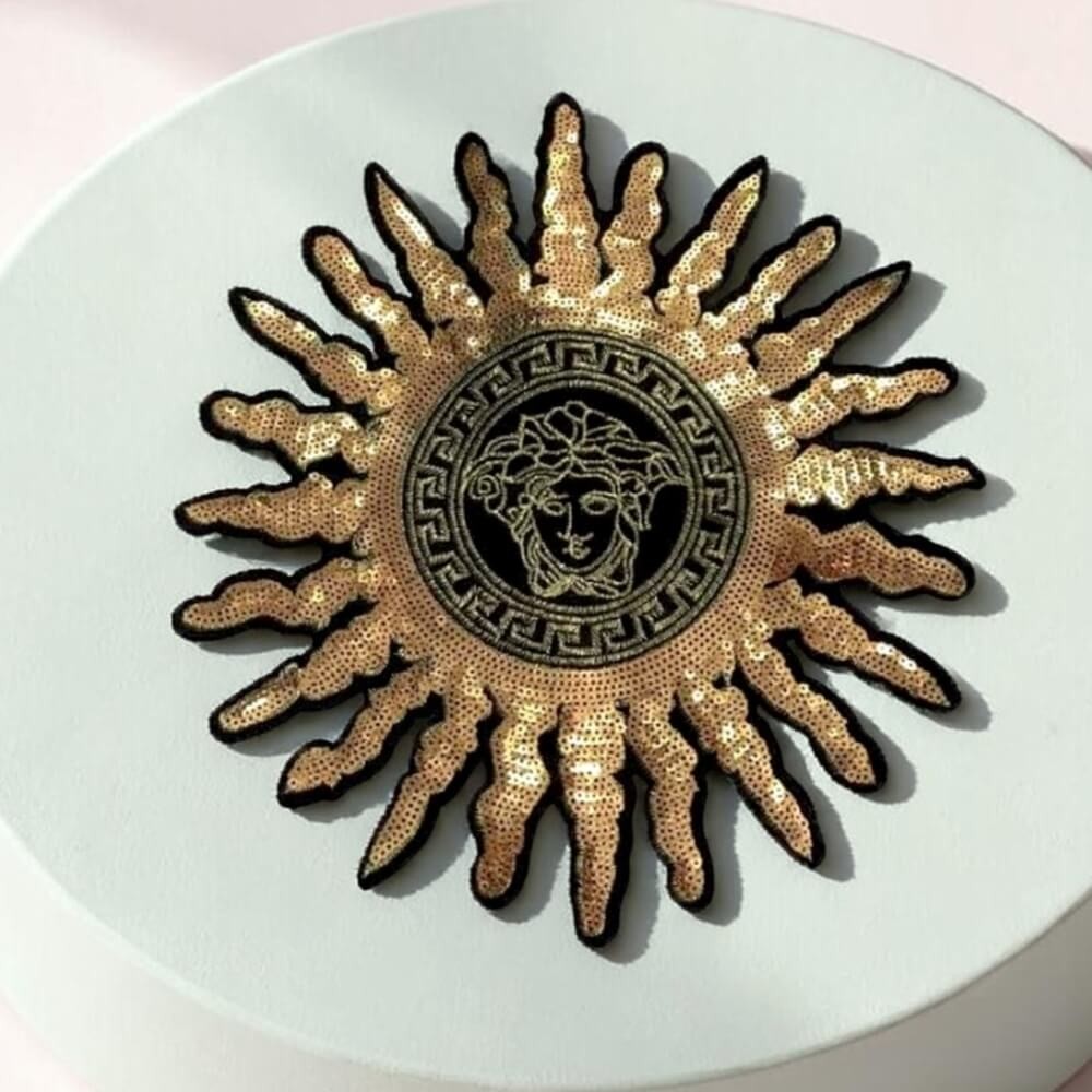 Le soleil décoratif traverse les époques. On le retrouve dans les bijoux, les tissus d’ameublement, les emblèmes anciens, les motifs de théâtre et certains vêtements de scène. Ici, il garde cette idée de rayonnement, de puissance calme, de chaleur visible.