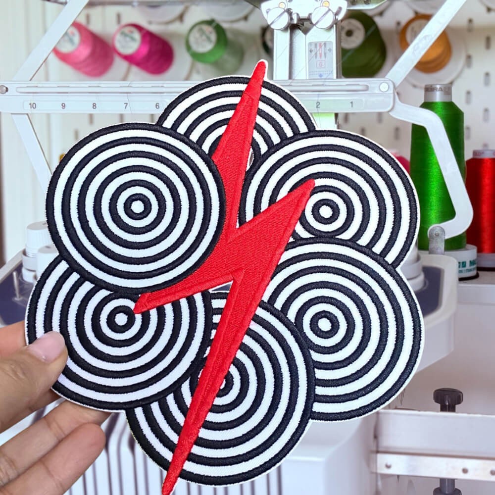 Avec ses cercles concentriques et son éclair graphique, ce patch brodé vibre d’une énergie visuelle ultra rock. Inspiré du pop-art, il électrise n’importe quelle tenue en un clin d’œil.