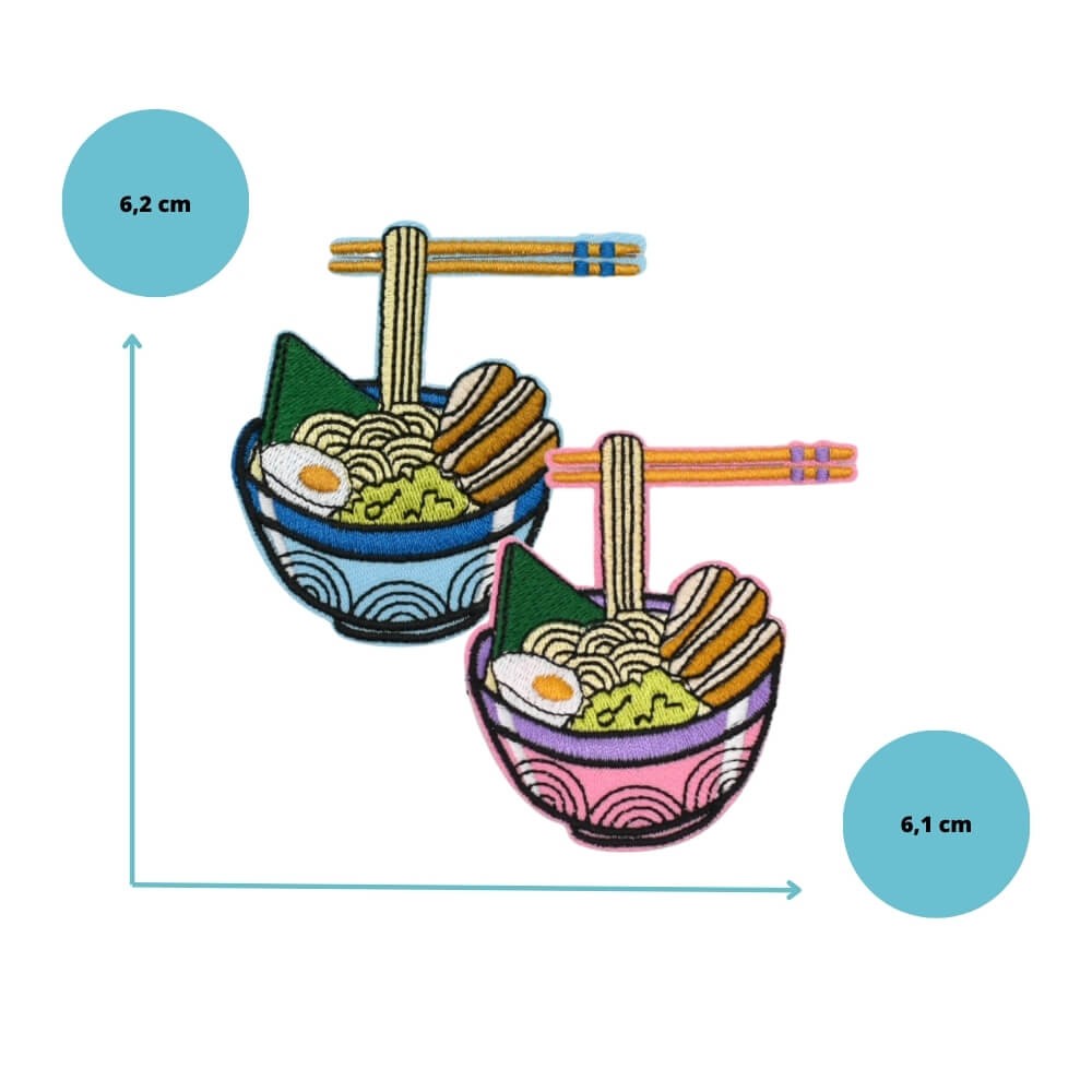 Ce patch brodé représente un bol de ramen : nouilles, bouillon, tranche de viande, algue nori et œuf, avec ses baguettes. Il donnera un côté fun et gourmand à vos tenues sans en faire trop.