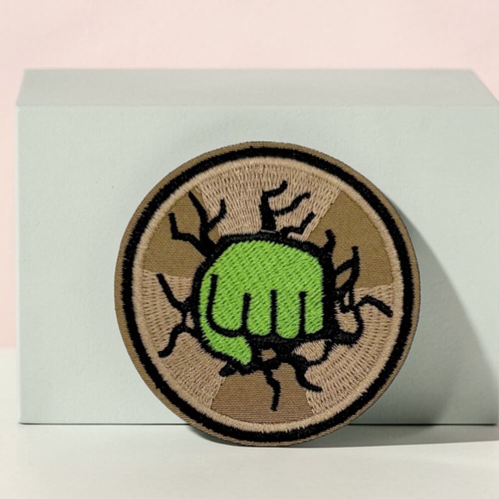 Ce patch brodé représente un poing vert surgissant d’un mur fissuré, symbole de force et de résilience inspiré du super-héros Hulk de l’univers des comics Marvel.