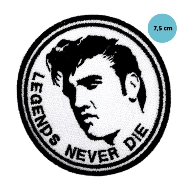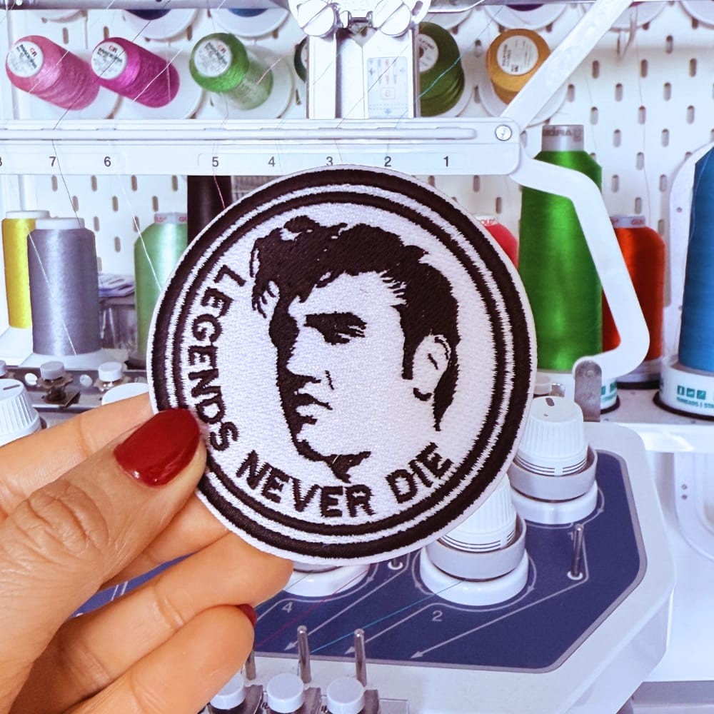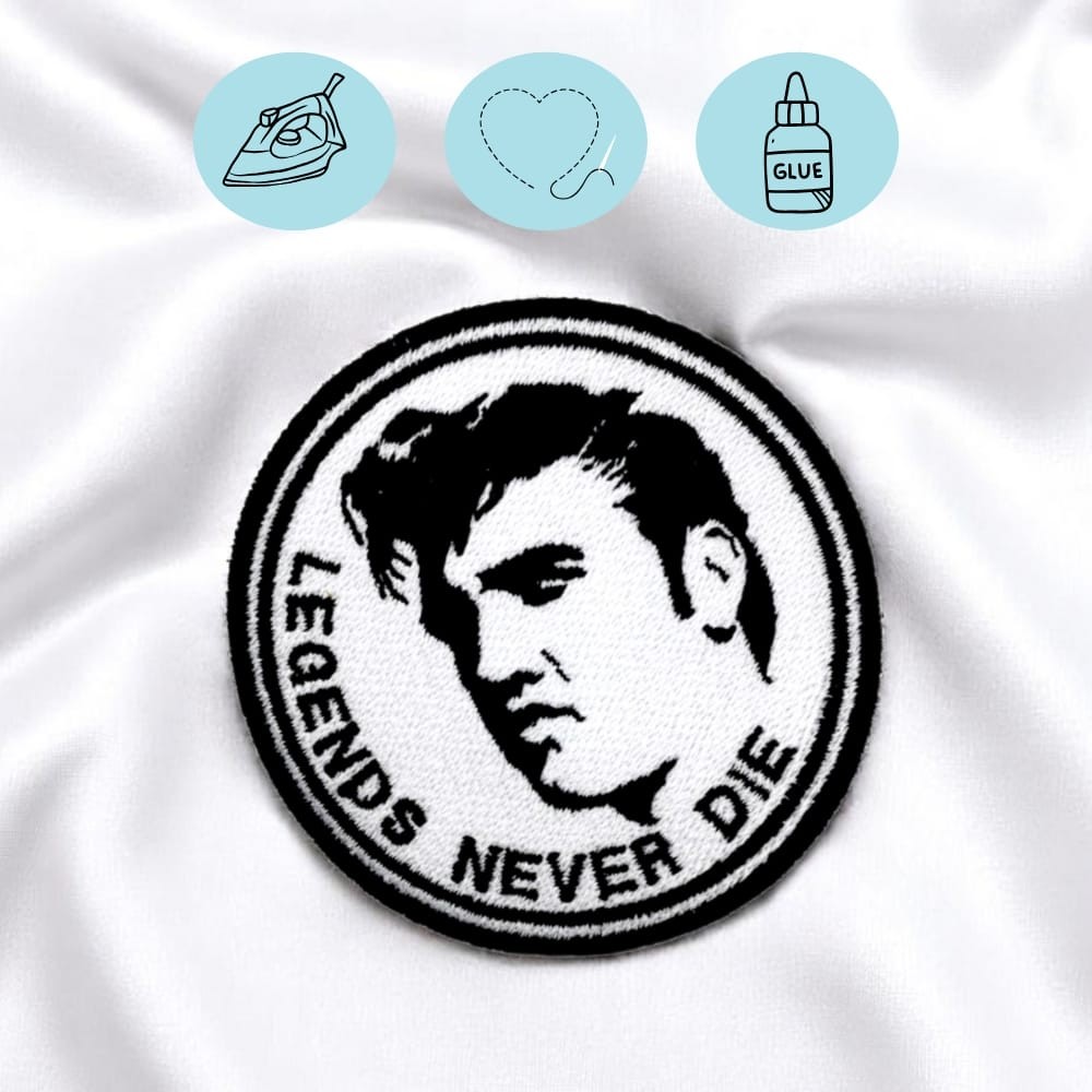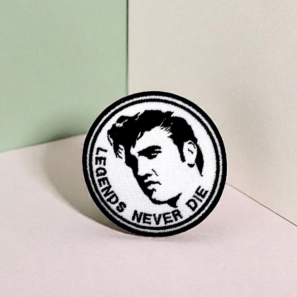 Ce patch brodé Elvis Presley Legends Never Die transforme une veste en jean, une casquette ou un sac en clin d’œil rock assumé.