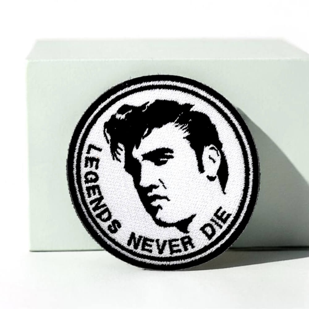 Ce patch rend hommage à Elvis Presley à travers un motif simple et immédiatement lisible : son portrait en noir et blanc, entouré de la phrase Legends Never Die. On retrouve ici l’esthétique des badges hommage, des visuels de fans et des objets rock qui prolongent la mémoire des grandes figures musicales.