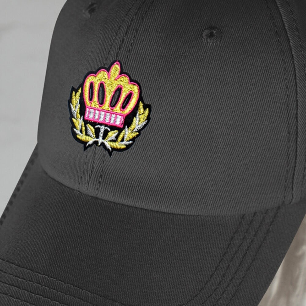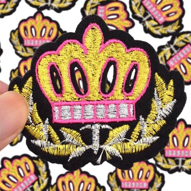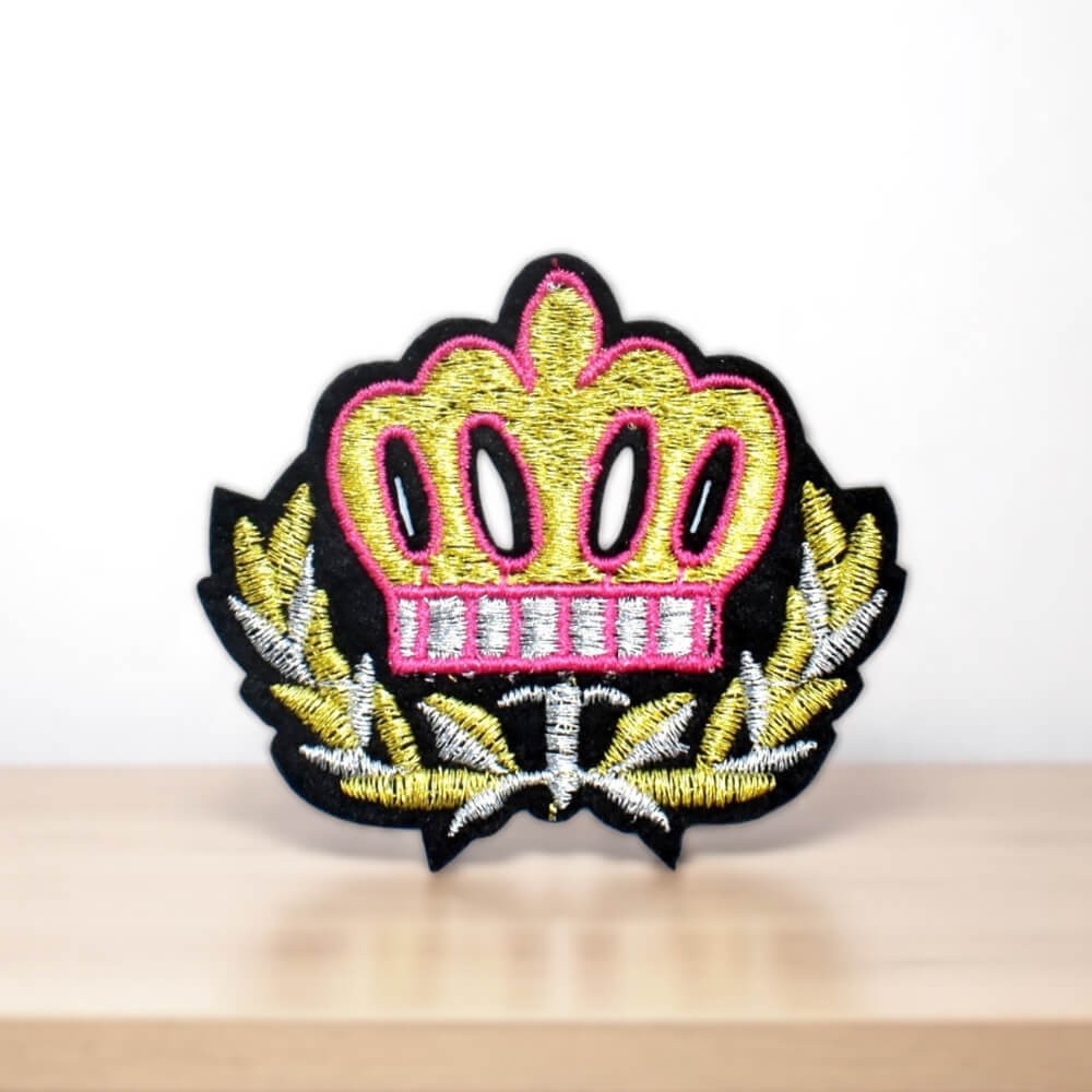 Vous cherchez un patch couronne original, coloré et élégant ? Ce modèle associe broderie dorée, contour rose fuchsia et laurier argenté pour un rendu royal modernisé.