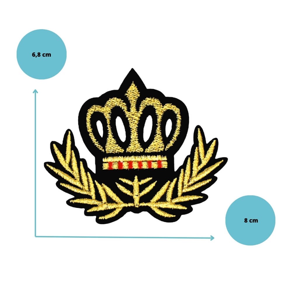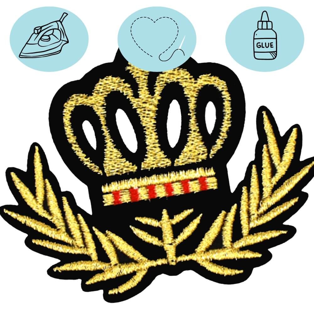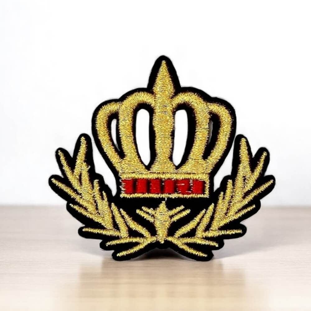 Vous cherchez un patch couronne élégant, doré et structuré pour customiser une veste, un sweat ou une casquette ? Ce modèle associe une broderie dense effet or et des lauriers graphiques pour un rendu super chic.
