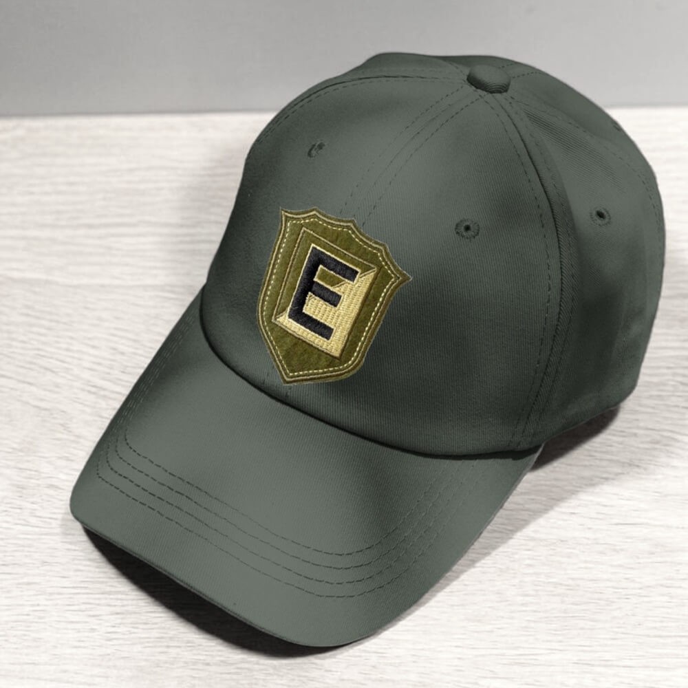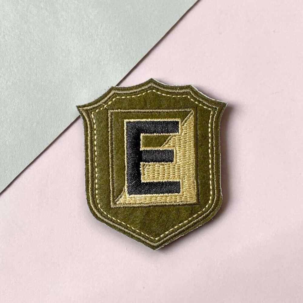 Ce patch reprend la forme d’un blason militaire avec une grande lettre E au centre. Il fait penser à un insigne d’unité, à une initiale portée comme un signe distinctif, à un détail qui donne tout de suite plus de personnalité à une casquette ou à une veste.