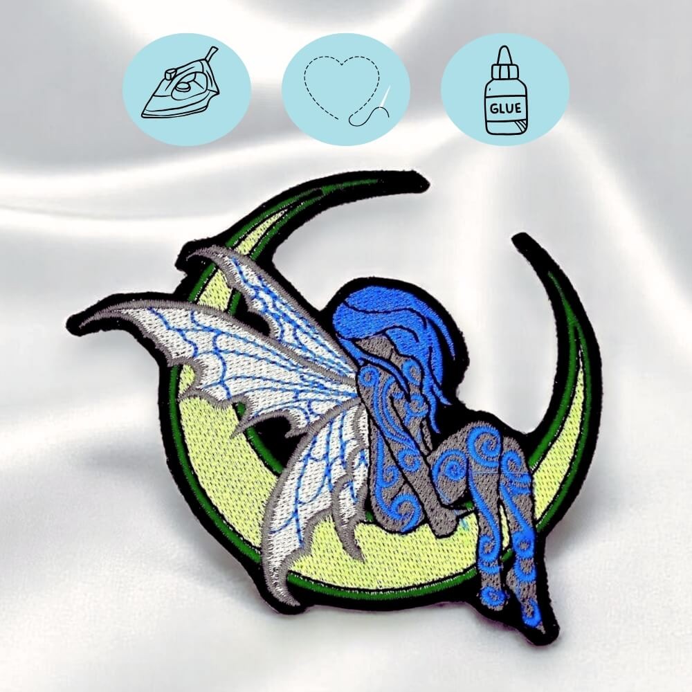 Un motif féerique et délicat qui attire l’œil. Cette fée assise sur son croissant de lune apporte une touche imaginaire et poétique à vos vêtements et accessoires.